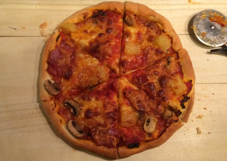 - Bak de pizza af tot de kaas gesmolten is en de korst goudbruin. Bij mij duurde dat zo’n 15 minuten.