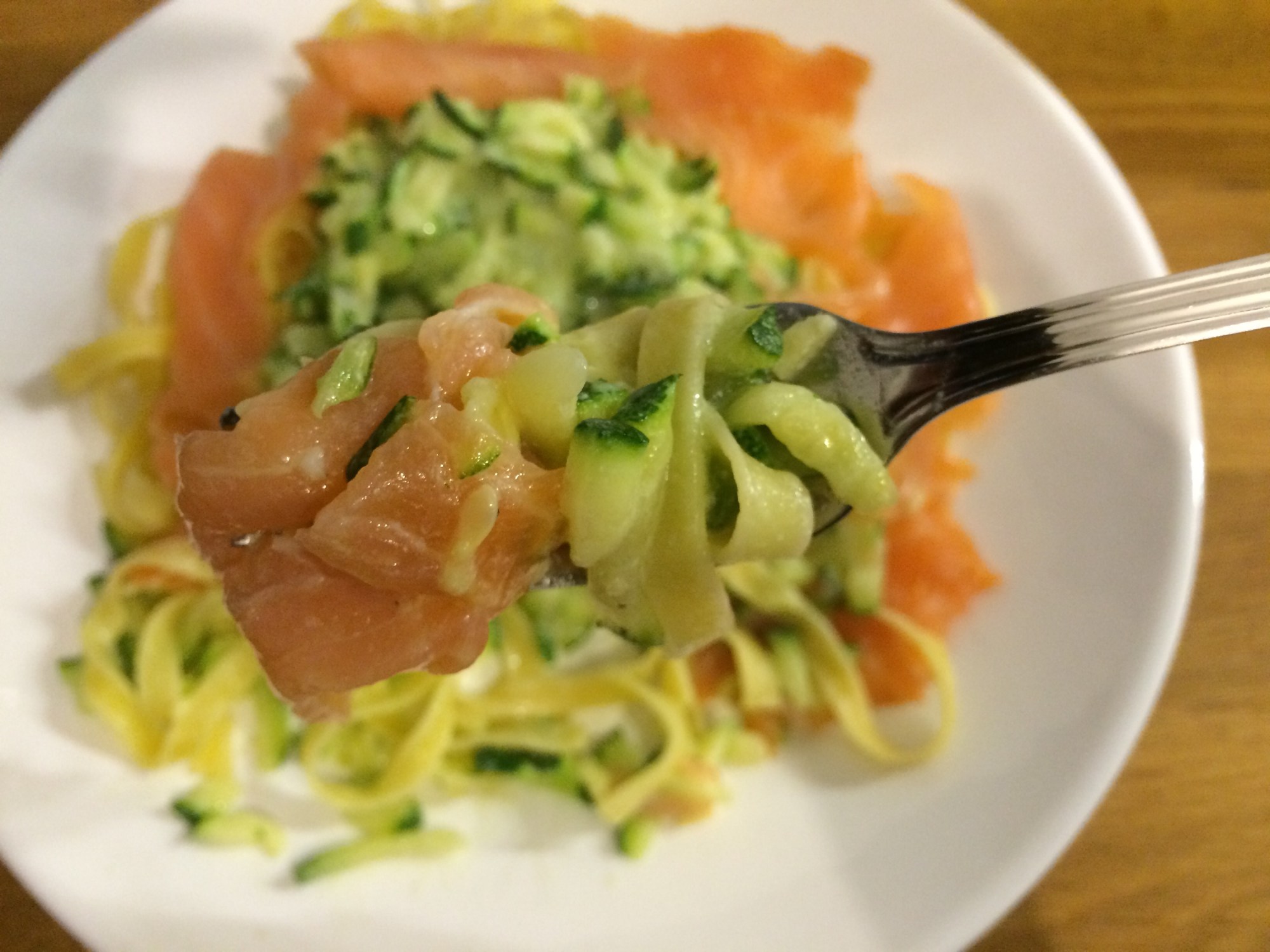 - Schep op elk bord de helft van de gekookte tagliatelle (180 gram) en de helft van de courgettesaus.