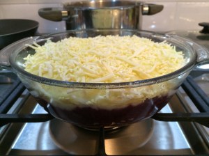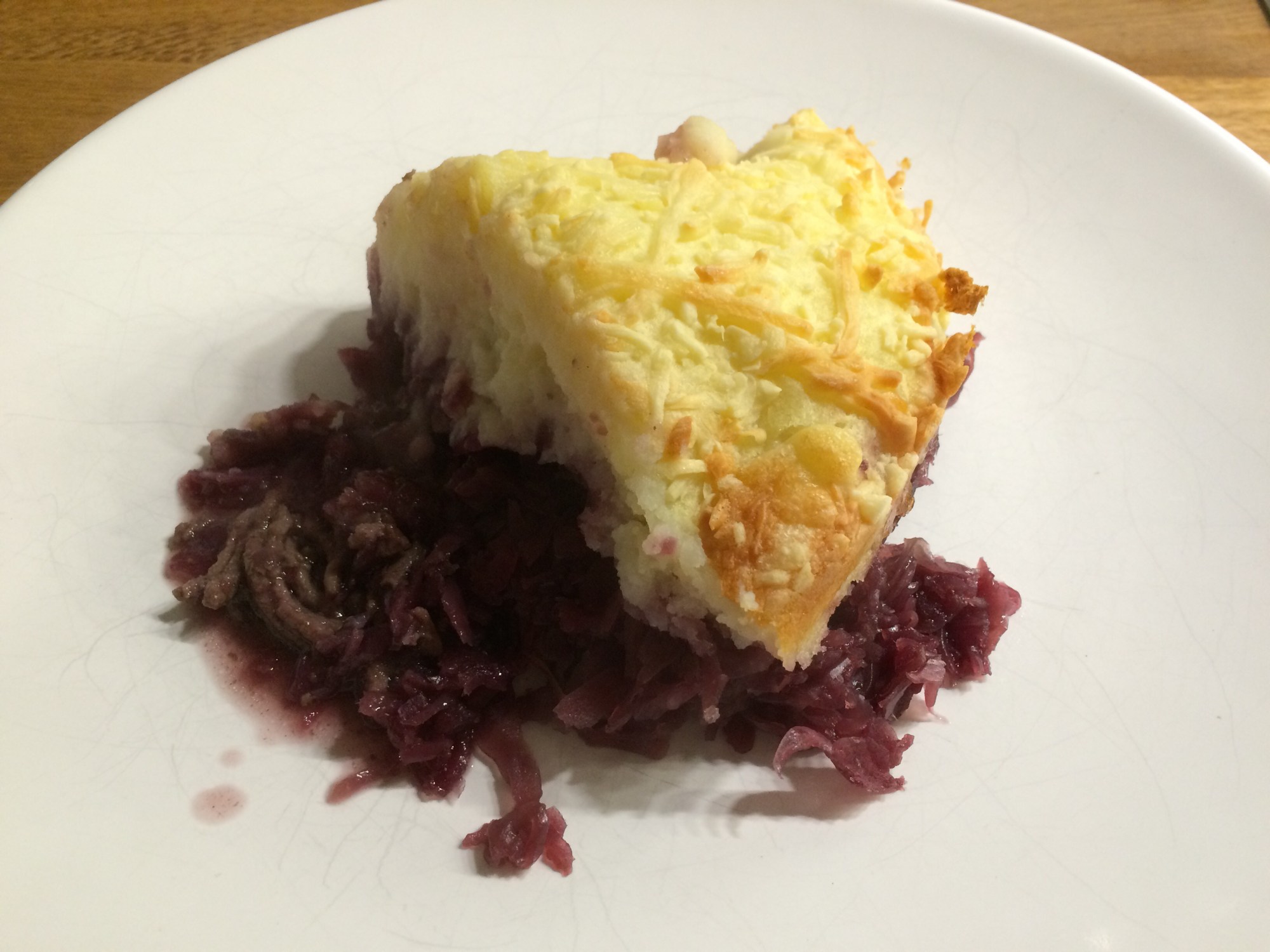 - Eindig met een laag aardappelpuree en bestrooi met met de geraspte kaas.