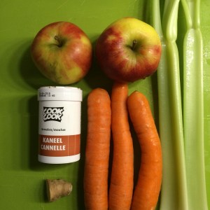 - Was de appels, bleekselderij en de wortels. Snijd alles in kleine stukjes en stop deze in de juicer.