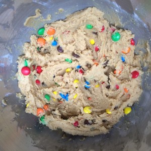 - Meng tot slot de M&M’s in het geheel, met een lepel of met een deeghaak (om de M&M’s heel te houden).