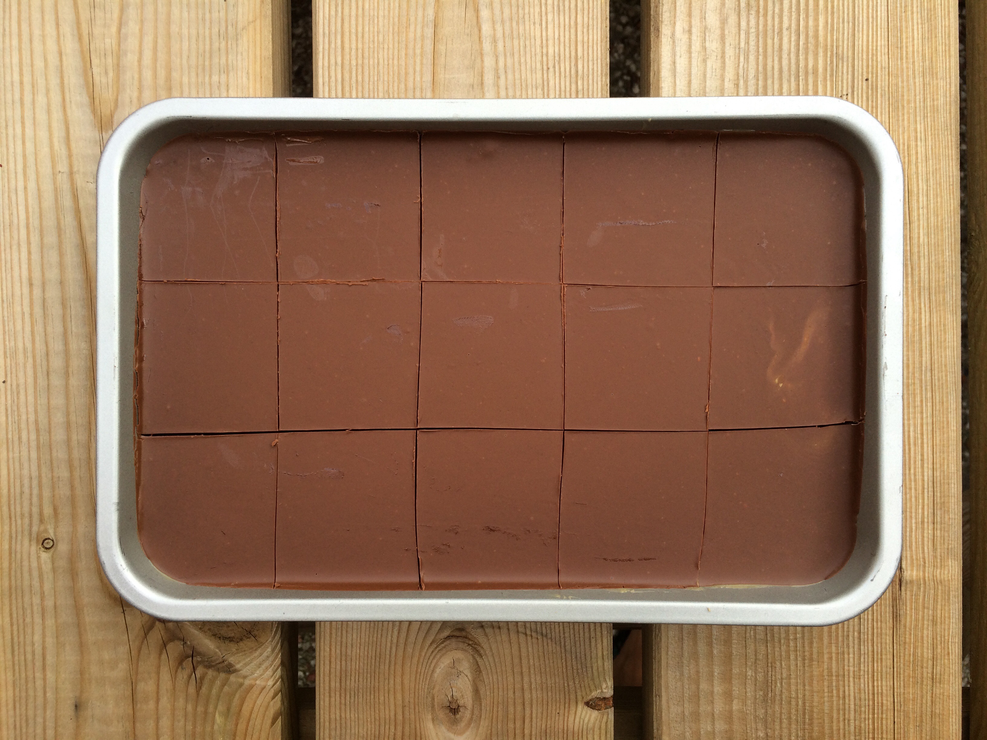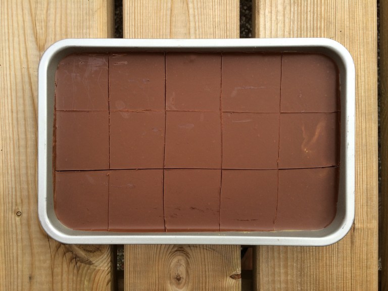 - Snijd de mega Snicker bar in de lengte in drieën en daarna in de breedte in vijven, zodat je 15 stukken van ongeveer 5,5 x 5,5 cm hebt. Haal de Snickers voorzichtig uit de vorm (het eerste hoekje kwam er bij mij niet zo mooi uit, dus de kans is groot dat je die zelf moet opeten… helaas 😉)