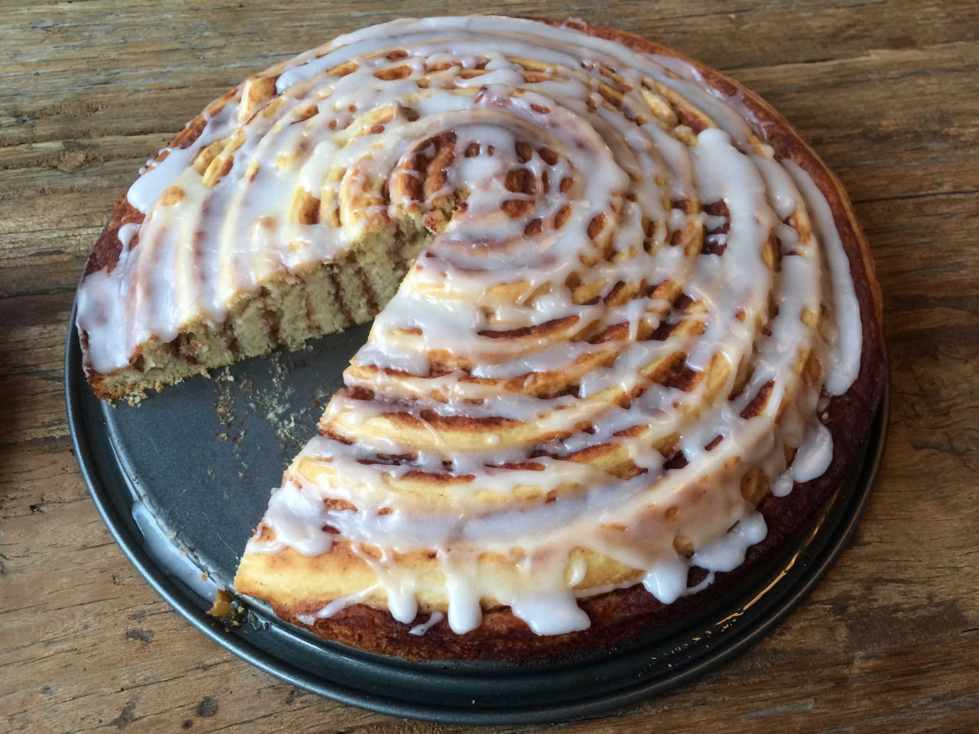 - Tot slot het glazuur. Haal de taart uit de oven en laat hem 10 minuten afkoelen. Doe net voor het serveren het glazuur erop. Zeef de poedersuiker in een kom, voeg de melk en vanille-extract toe en mix alles door elkaar tot een glad glazuur. Als je dikker glazuur wilt, kun je altijd meer poedersuiker toevoegen. Giet het glazuur bovenop de taart.
