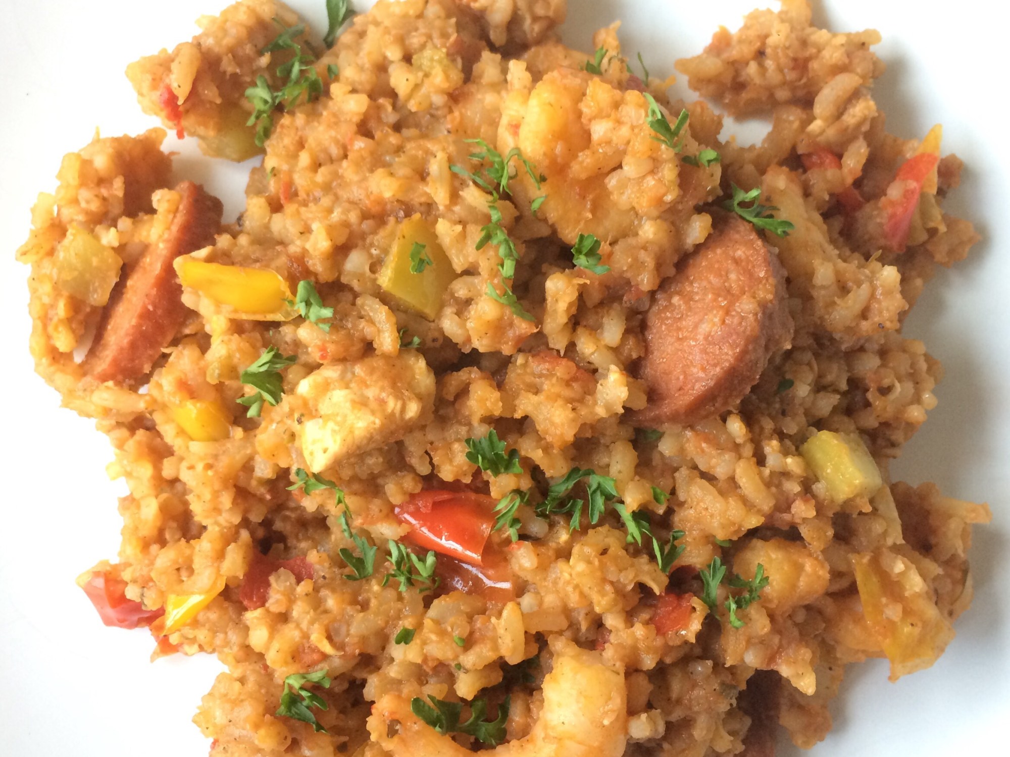 Een echte klassieker uit de Creoolse keuken! Jambalaya is een pittig rijstgerecht met vlees en/of vis (garnalen of rivierkreeften) en veel verschillende groenten. Traditioneel zijn dit de ‘holy trinity’ (ui, paprika en bleekselderij), tomaten, hete peper… Maar je kan er eigenlijk alles in doen wat je wilt / wat je nog hebt liggen. Het gerecht schijnt van de Spanjaarden te komen, die in Louisiana hun geliefde ‘paella’ wilden maken. Dit is later dus geĆ«volueerd tot Jambalaya.