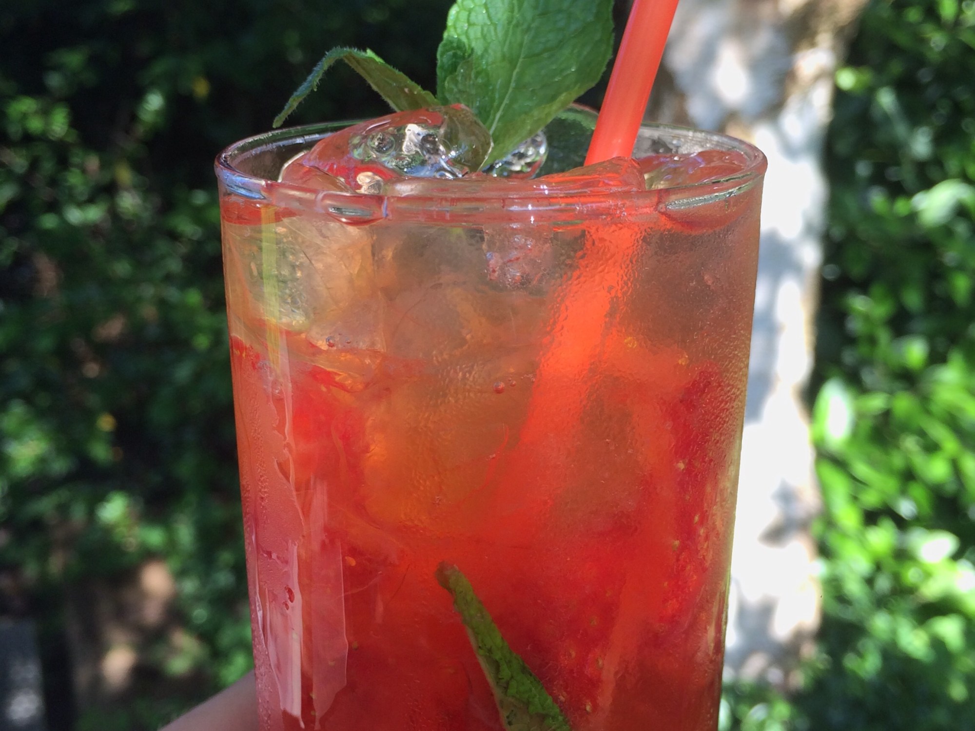 - Vul het glas tot (net boven) de rand met crushed ice en top af met nog wat bruiswater. Garneer met een takje munt en een rietje.