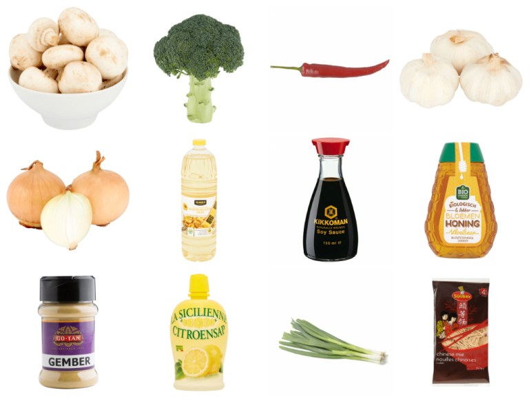 - Verhit een eetlepel olijfolie in de wok op middelhoog vuur. Voeg de knoflook, ui en rode peper toe en verhit 1 minuut. Voeg de broccoli toe en roerbak ongeveer 5 minuten. Maak intussen de terikyakisaus. Voeg na de 5 minuten de champignons toe en bak deze nog een paar minuten mee.