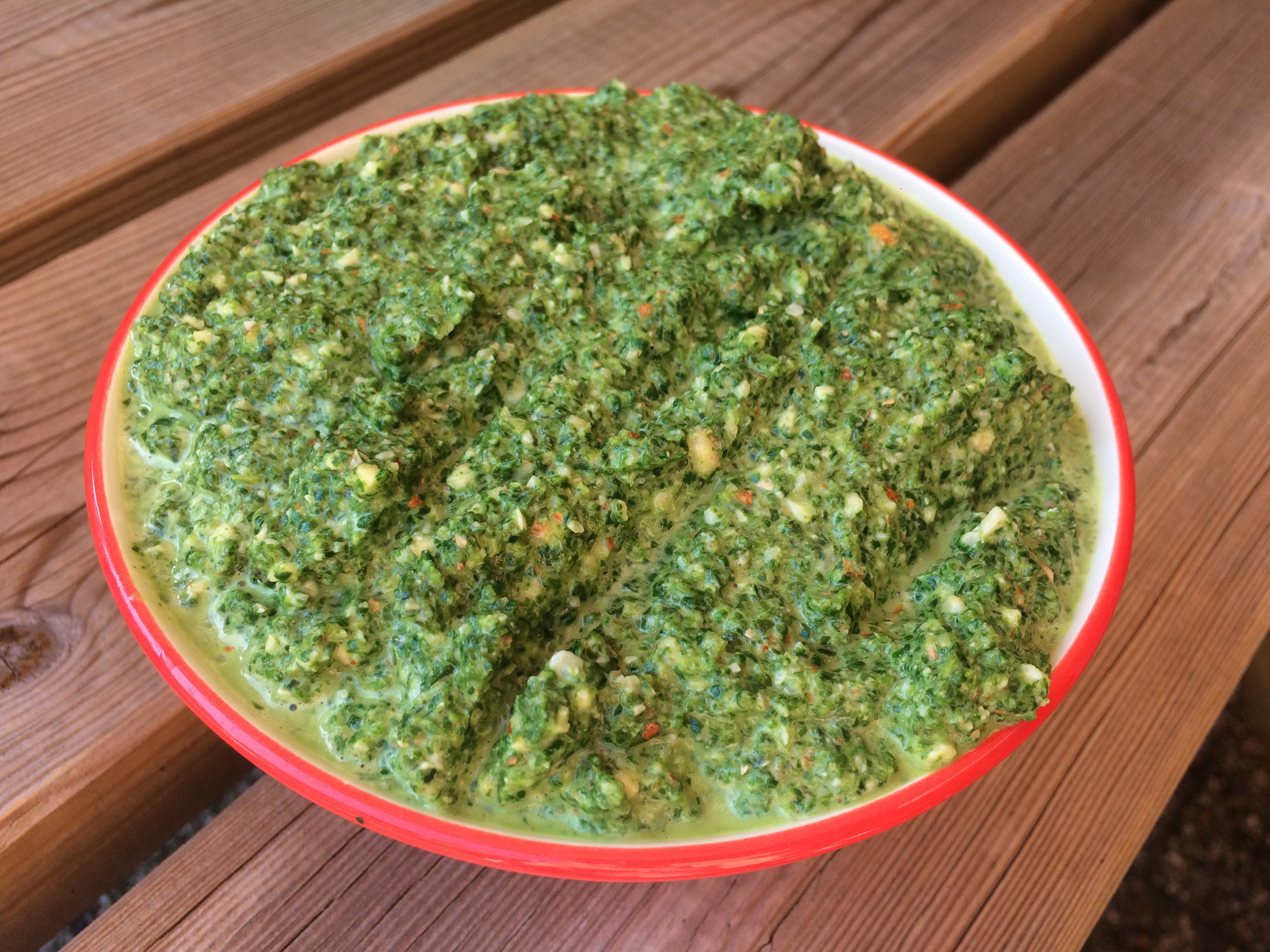 Denk aan de smaken van Parmezaanse kaas, amandelen, olijfolie, knoflook, spinazie, boerenkool, basilicum en een beetje citroen. Mmmm…