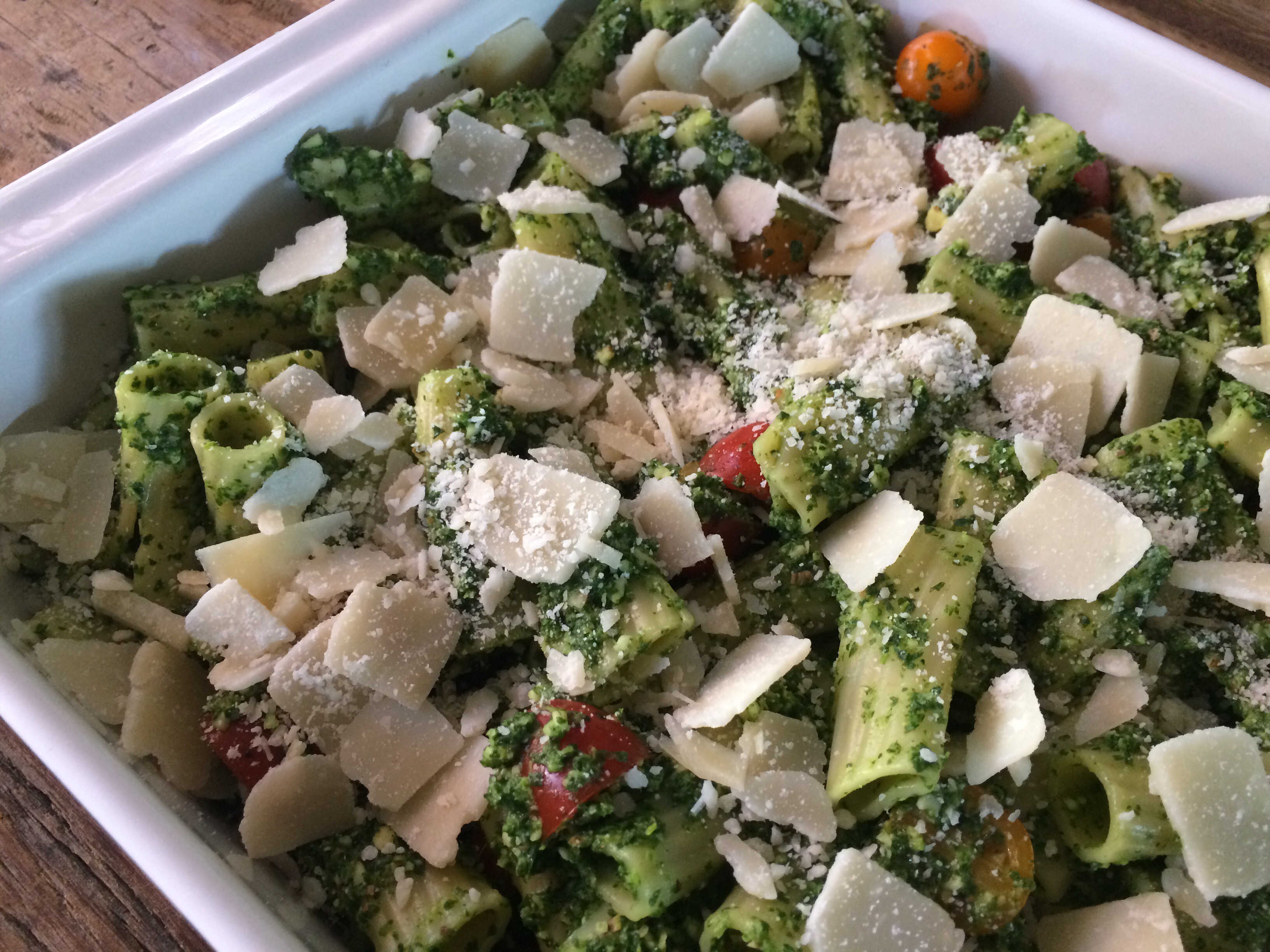 - Verwarm de oven voor op 200 graden. Meng de gekookte rigatoni met de tomaten en de pesto.