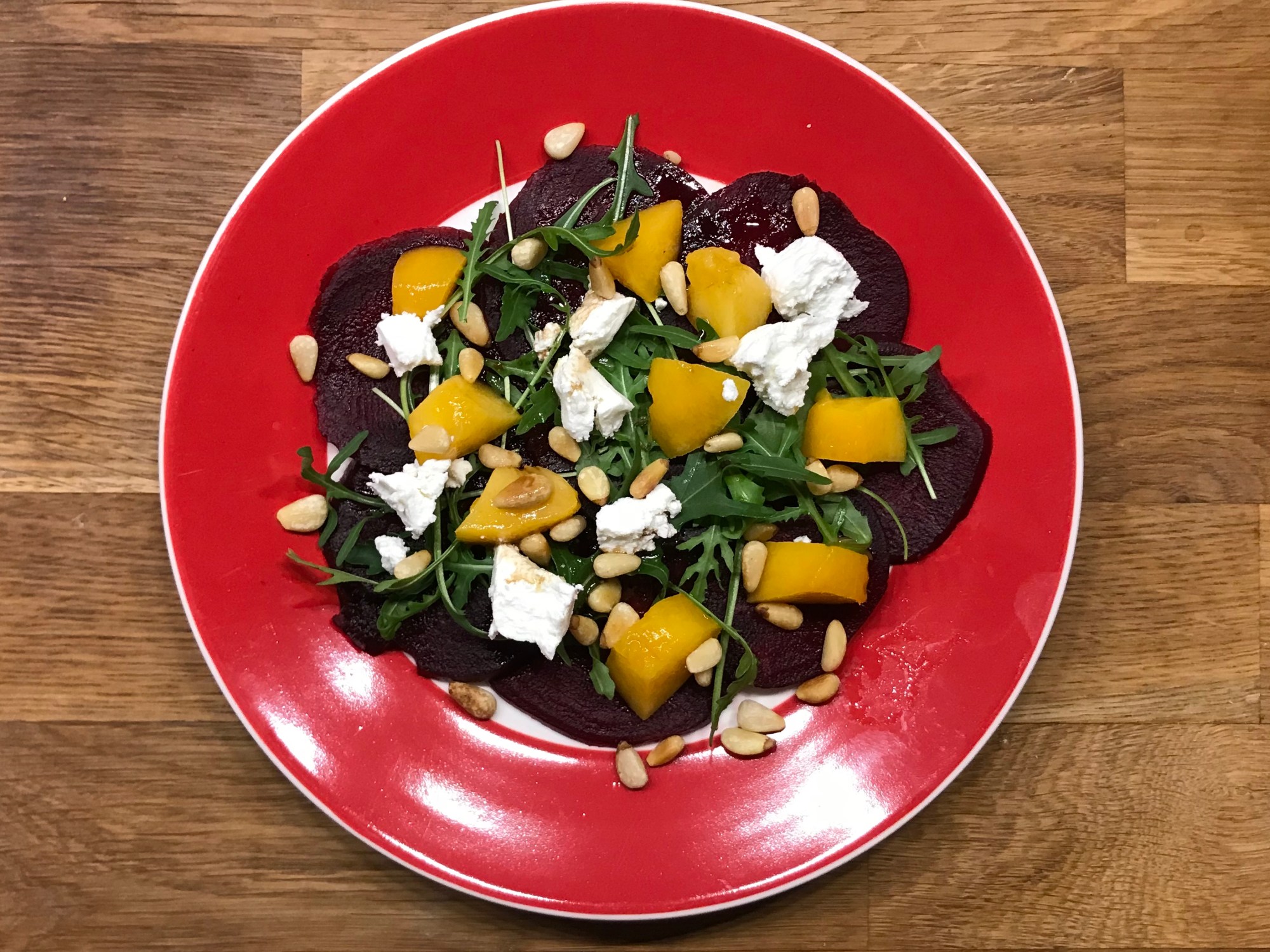 - Verdeel de bietenplakjes over 4 borden en verdeel er wat rucola over. Bestrooi de borden daarna met wat perzikstukjes, geitenkaas en de pompoen- of pijnboompitten.