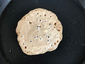 - Als de bovenkant een beetje opdroogt en er bubbeltjes in komen, kun je de pannenkoek omdraaien. Bak de andere kant nog even goudbruin en je pannenkoek is klaar!